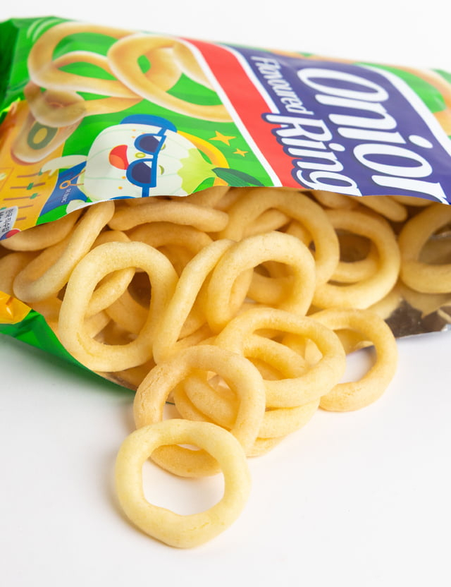Salgadinho Onion Flavored Rings, coreano e sabor cebola. NÃO CONTEM PIMENTA Características: Ingredientes: Farinha de trigo, amido de trigo, açúcar, sal, óleo de arroz, batata, óleo de palmeira, cebola, proteina hidrolisada da soja, riboflavina, lactose. Informações adicionais: "Contém Glúten" e Zero Gordura Trans. Embalagem: Contém um pacote Onion Flavored Rings Cebola - 50 gramas Fabricante: Nong Shim Co. Origem: Coréia do Sul (Produtos Coreanos