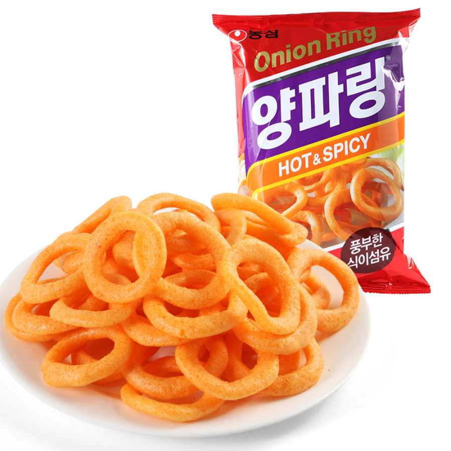 Salgadinho Onion Flavored Rings Hot e Spicy, coreano com sabor de cebola apimentada. Características: Ingredientes: Farinha de trigo, amido de trigo, óleo de farelo de arroz, batata, óleo de palma, cebola em pó, açúcar, sal, pimenta chilli em pó, riboflavina, carmim, glutamato de sódio. Informações adicionais: "Contém Glúten" e " Zero Gordura Trans". Embalagem: Contém um pacote Onion Flavored Rings Cebola Apimentada Hot e Spicy 40 gramas Fabricante: Nong Shim Co. Origem: Coréia do Sul (Produtos Coreanos